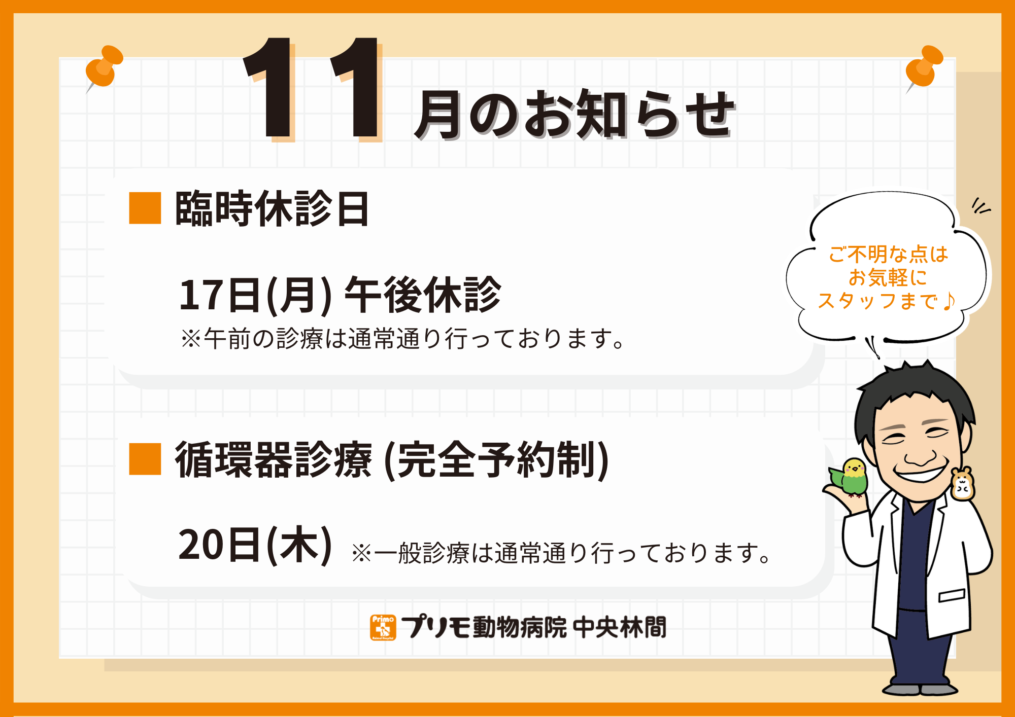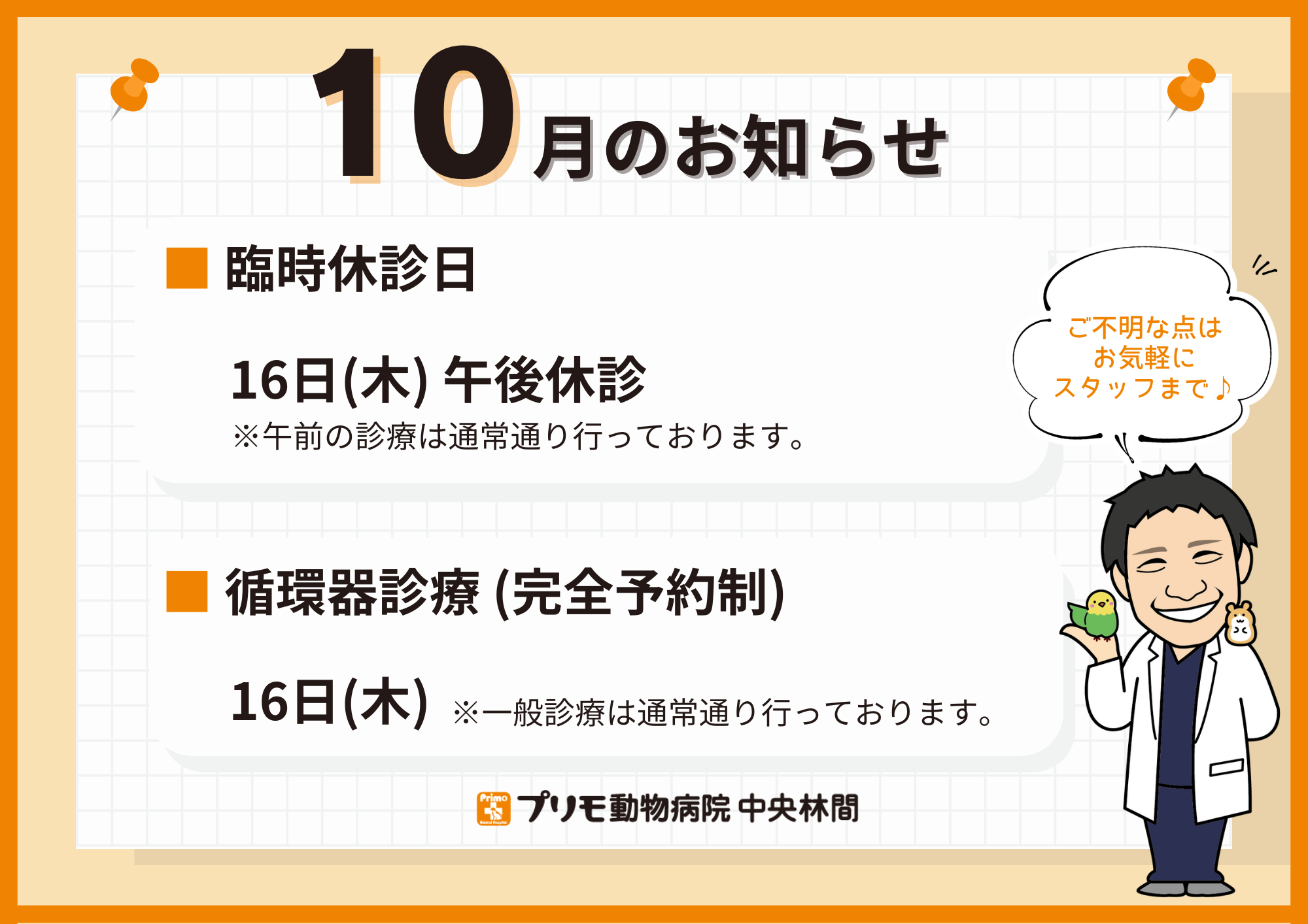 当院が休診の際には、プリモ動物病院 相模大野へご連絡ください。
