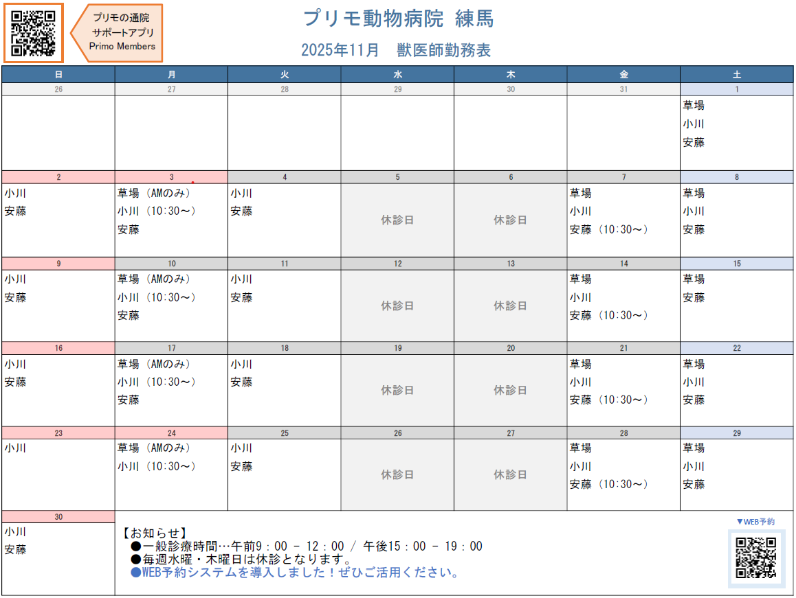 診療時間 月 火 水 木 金 土 日 祝 9:00~12:00 〇 〇 ー ー 〇 〇 〇 〇 12:00~15:00 手術・検査 15:00~19:00 〇 〇 ー ー 〇 〇 〇 〇 当院は予約優先制です。(当日予約も可能です)