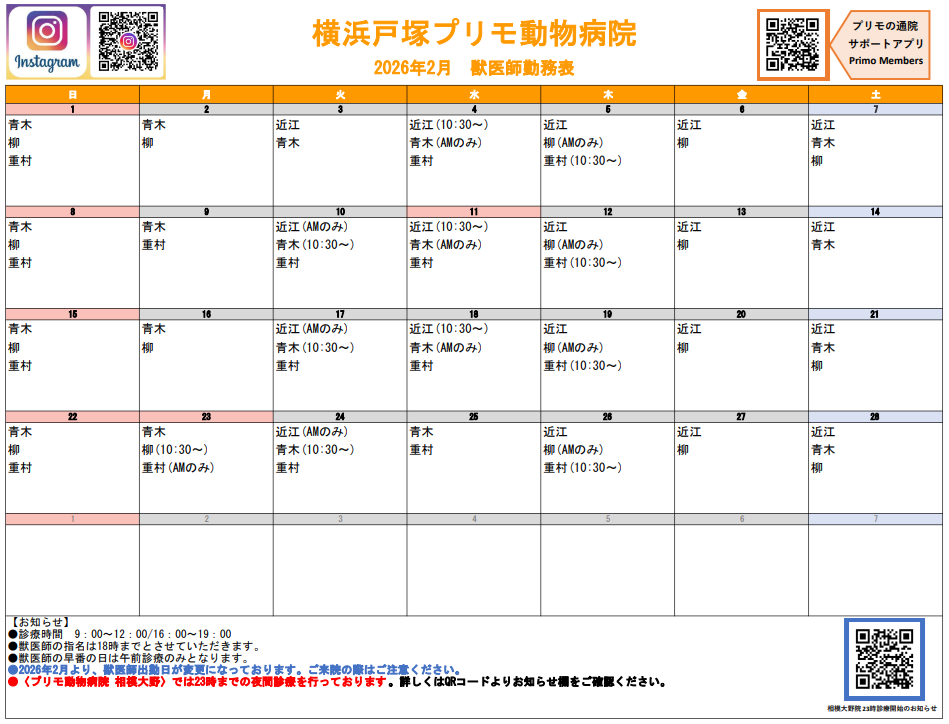 ※院長以外の獣医師はご予約不要です。(獣医師の指名は18時まで)