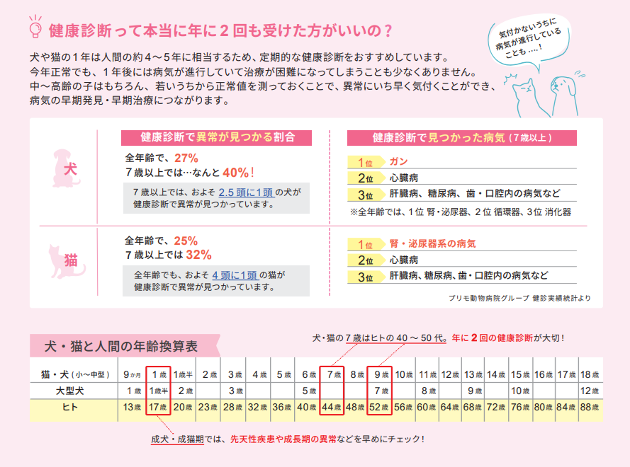 わんちゃんやねこちゃんの1年は人間の4~5年に相当するため、定期的な健康診断をおすすめしています。