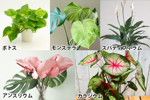 たとえば、ポトス・モンステラ・スパティフィラム・アンスリウム・カラジウムなどのサトイモ科の植物です。