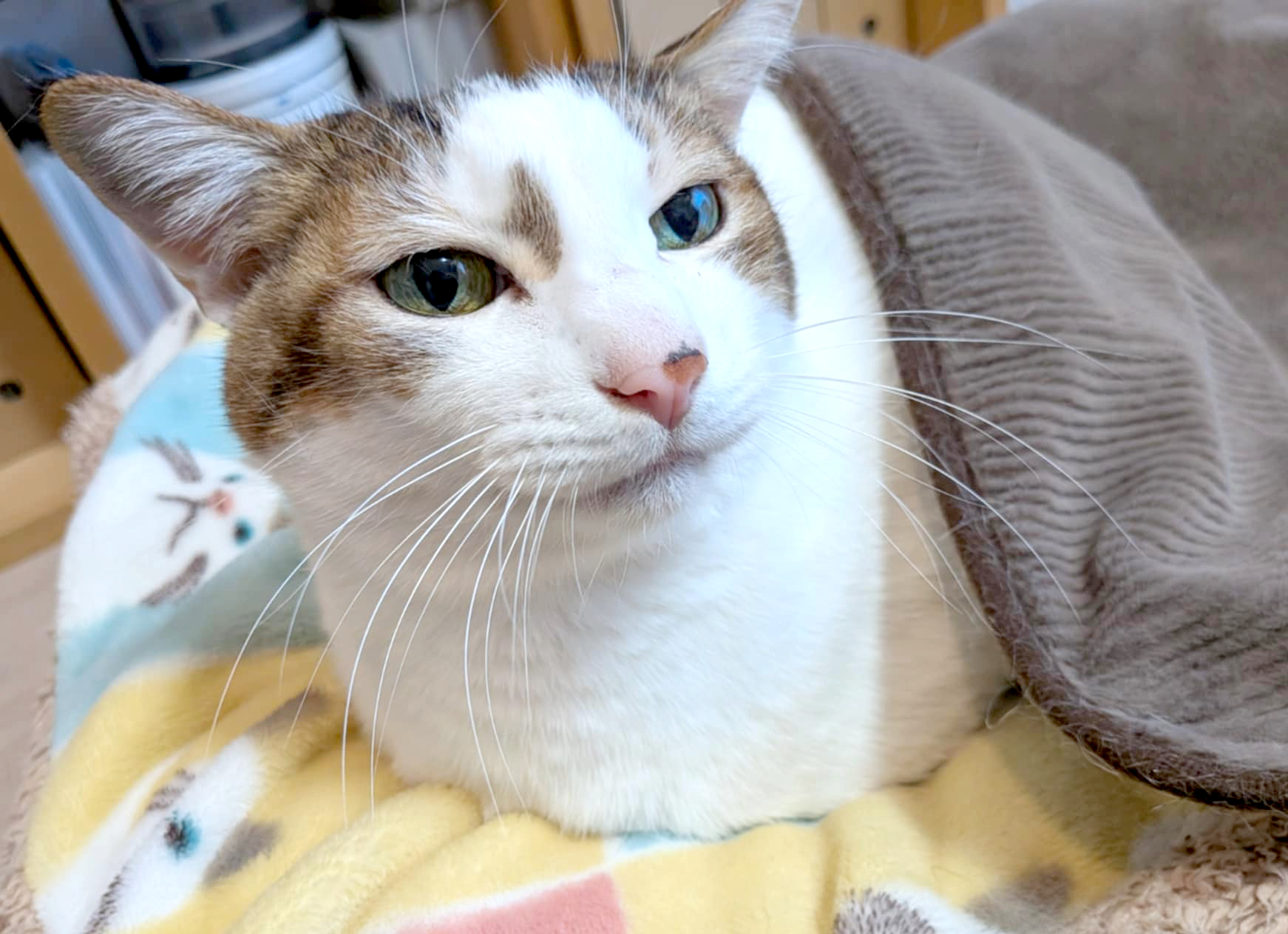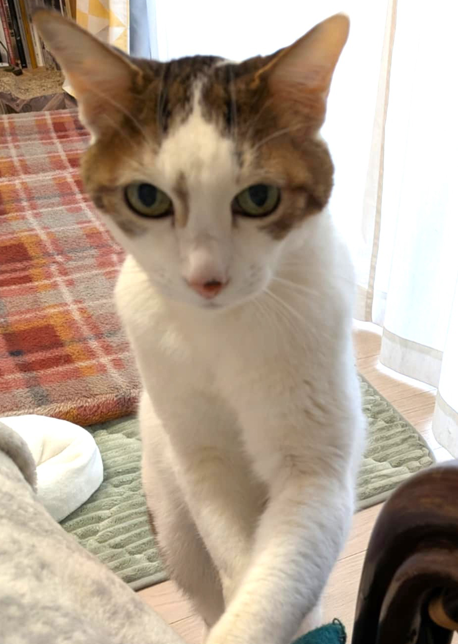 4月に20歳になって、白内障も進み、ほとんど見えない生活になりました。排泄の粗相も多くなり、トイレシートを広く敷き詰めているんですが、はずしていることが多くあります。昼間は誰もいない中お留守番なので、夕方帰ると家がすごいことになっていることが多々あります。日中のオムツの着用も考えましたが、着用せず、ノンストレスで過ごしています。大好きなチーズを食べながら、まだまだ長生きしてほしいです。